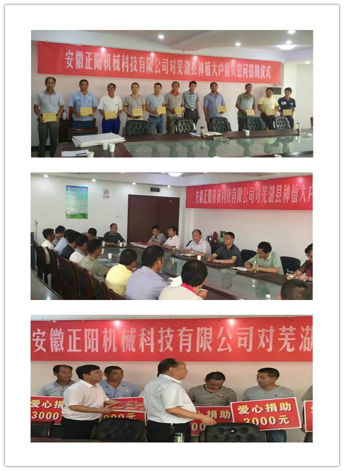 同時我公司針對今年長江中下游、江淮區(qū)域發(fā)生的嚴(yán)重的洪澇災(zāi)害勇于擔(dān)當(dāng),注重快速發(fā)展自身的同時更高度重視企業(yè)社會責(zé)任,本著以回報社會為己任;企業(yè)利潤來之于民、用之于民;義利兼顧的宗旨,安徽正陽機械科技有限公司總經(jīng)理張為法于2016年7月13日下午前往“正陽”糧食烘干機主銷區(qū)域安徽蕪湖、六安、湖北孝感等受災(zāi)嚴(yán)重地區(qū)捐贈現(xiàn)金數(shù)十萬元,幫助災(zāi)區(qū)人民萬眾一心共抗洪災(zāi),盡快恢復(fù)生產(chǎn),讓受災(zāi)群眾真實感受到黨和政府的溫暖、民營企業(yè)家的責(zé)任,公司以正能量品牌的形象和風(fēng)范履行了自身應(yīng)盡的社會責(zé)任。